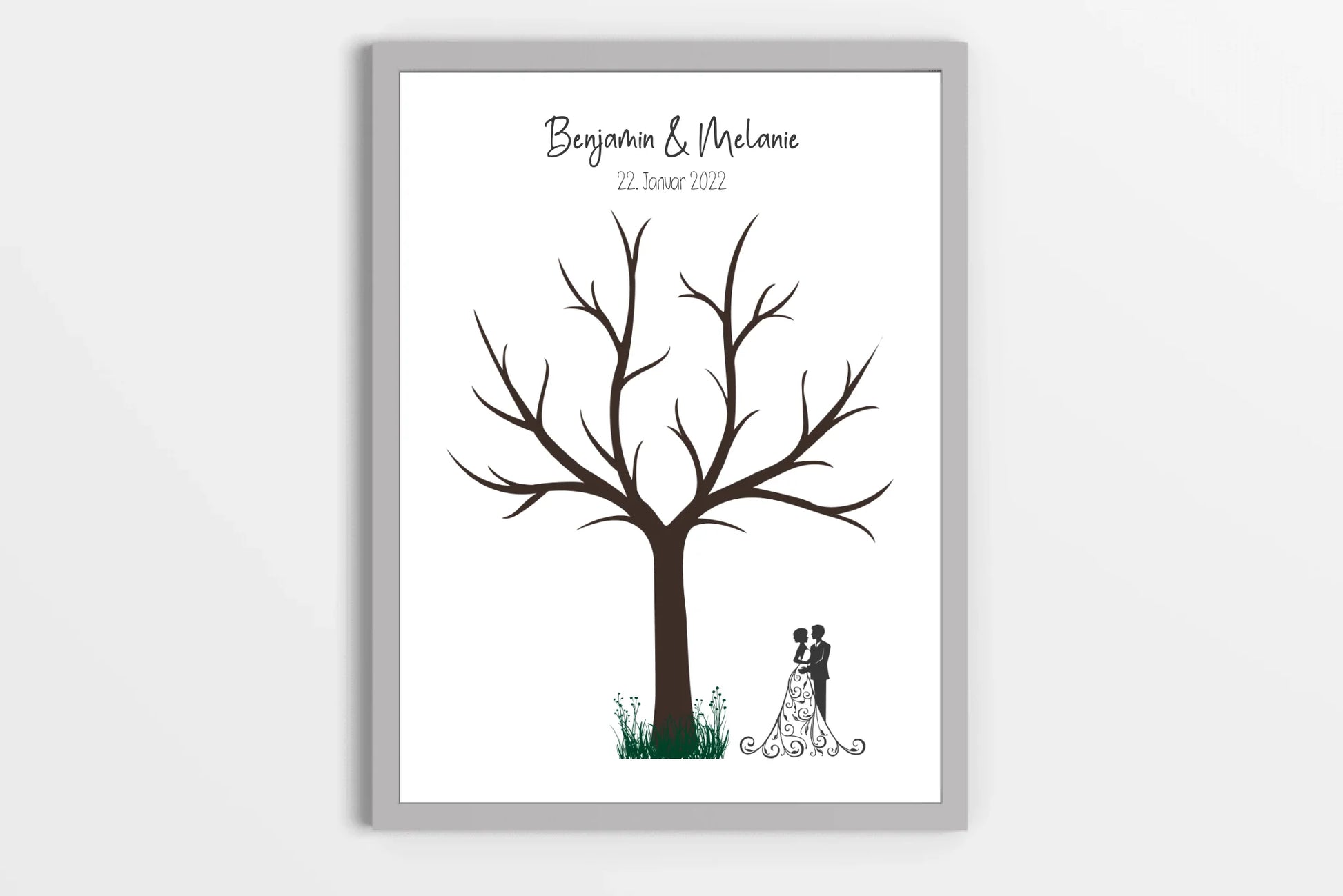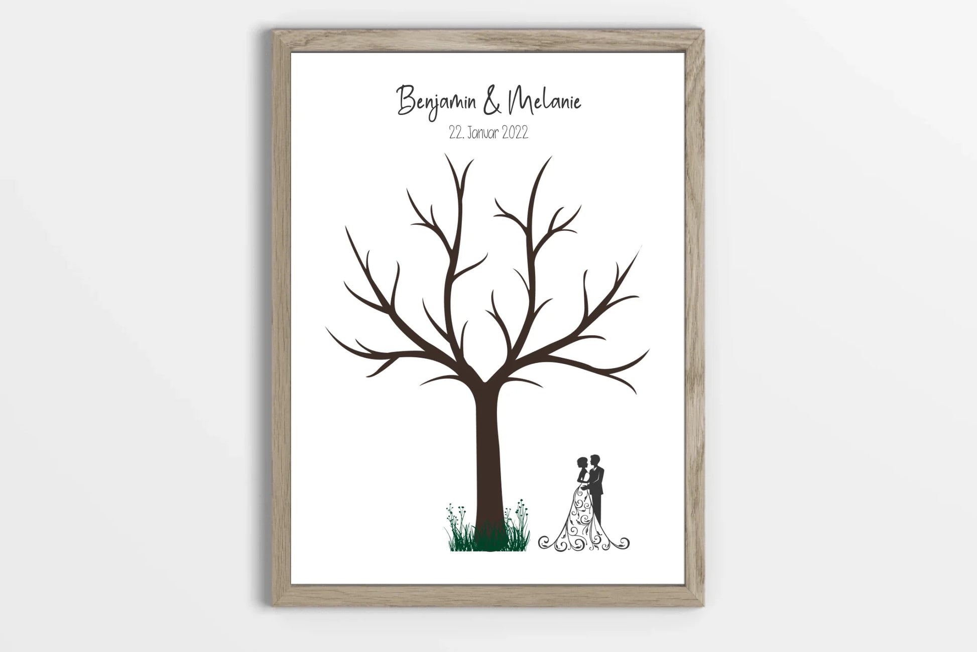 Die Gäste hinterlassen ihre Fingerabdrücke als bunte Blätter auf dem Baum – so entsteht ein einzigartiges Kunstwerk voller Erinnerungen. Ideal als Erinnerung an die Trauung oder als Geschenk für das Brautpaar