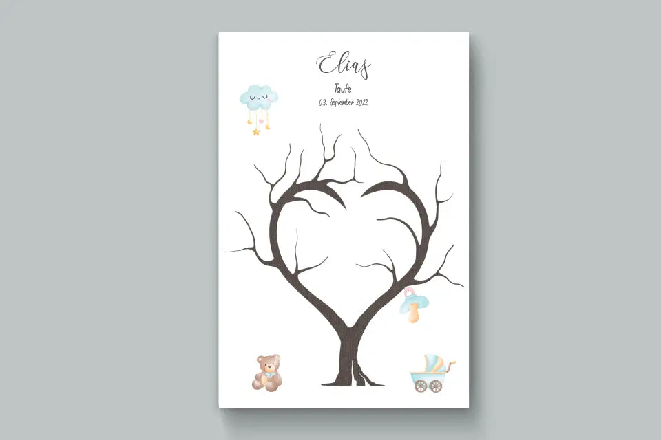 Das Fingerabdruck Gästebuch ist eine kreative Alternative zum traditionellen Gästebuch und ermöglicht es Ihren Gästen, sich auf einzigartige Weise zu verewigen. Jeder Gast kann seinen Fingerabdruck auf dem Bild hinterlassen und sich so auf eine besondere Art und Weise mit Ihrem Kind und der Taufe verbinden.