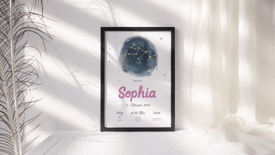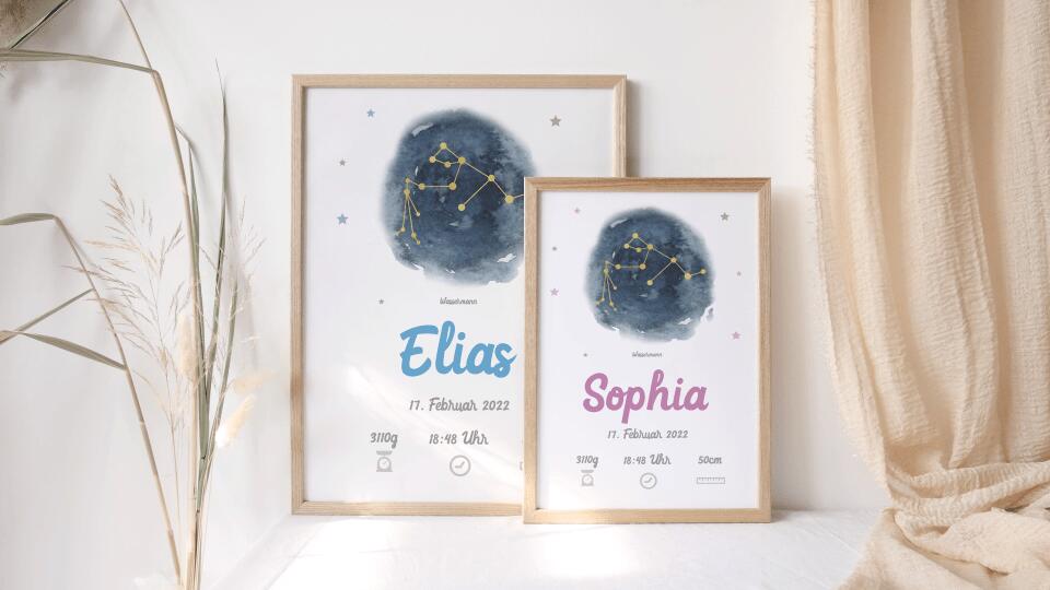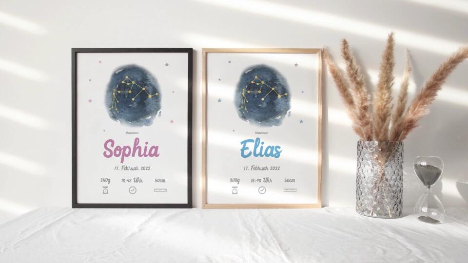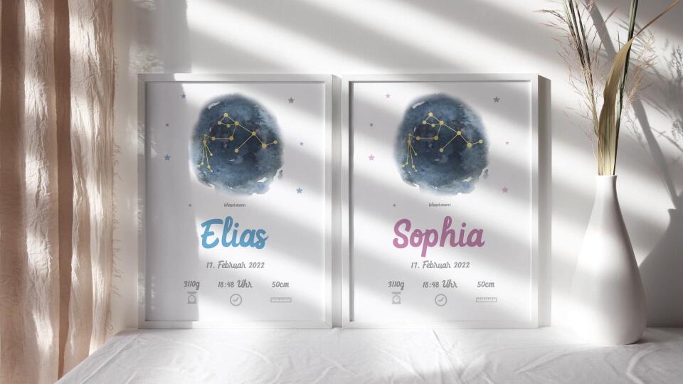 Willkommen bei unserem personalisierten Geburtsposter mit Sternzeichen! Dieses einzigartige Poster ist das ideale Geschenk für Eltern zur Geburt ihres Babys.