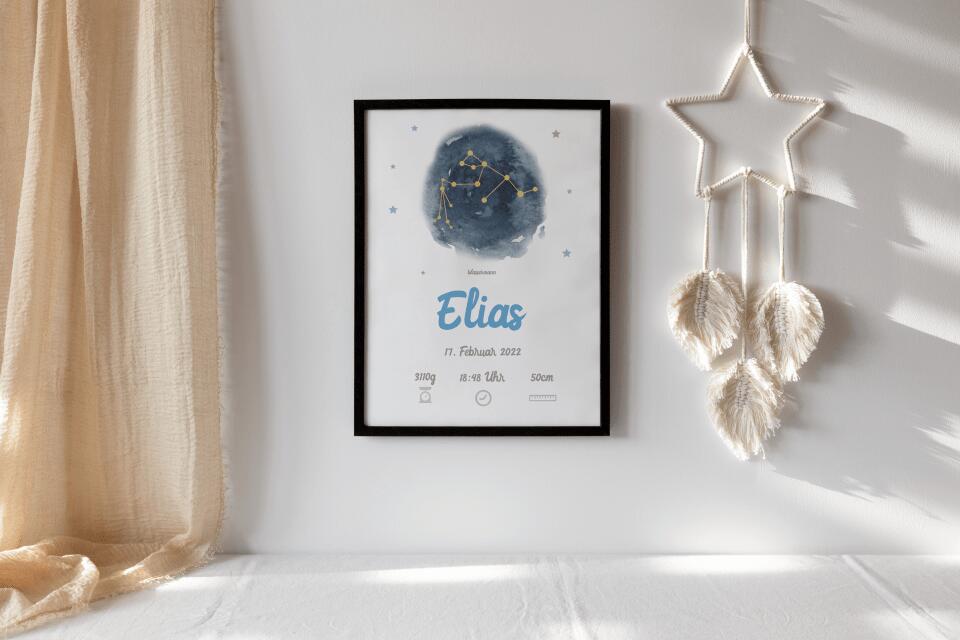 Unser personalisiertes Geburtsposter mit Sternzeichen ist das ideale Geschenk für Neugeborene und wird sicherlich für viele Jahre ein besonderes Erinnerungsstück sein. Bestellen Sie jetzt und machen Sie das Geschenk zur Geburt zu etwas ganz Besonderem!