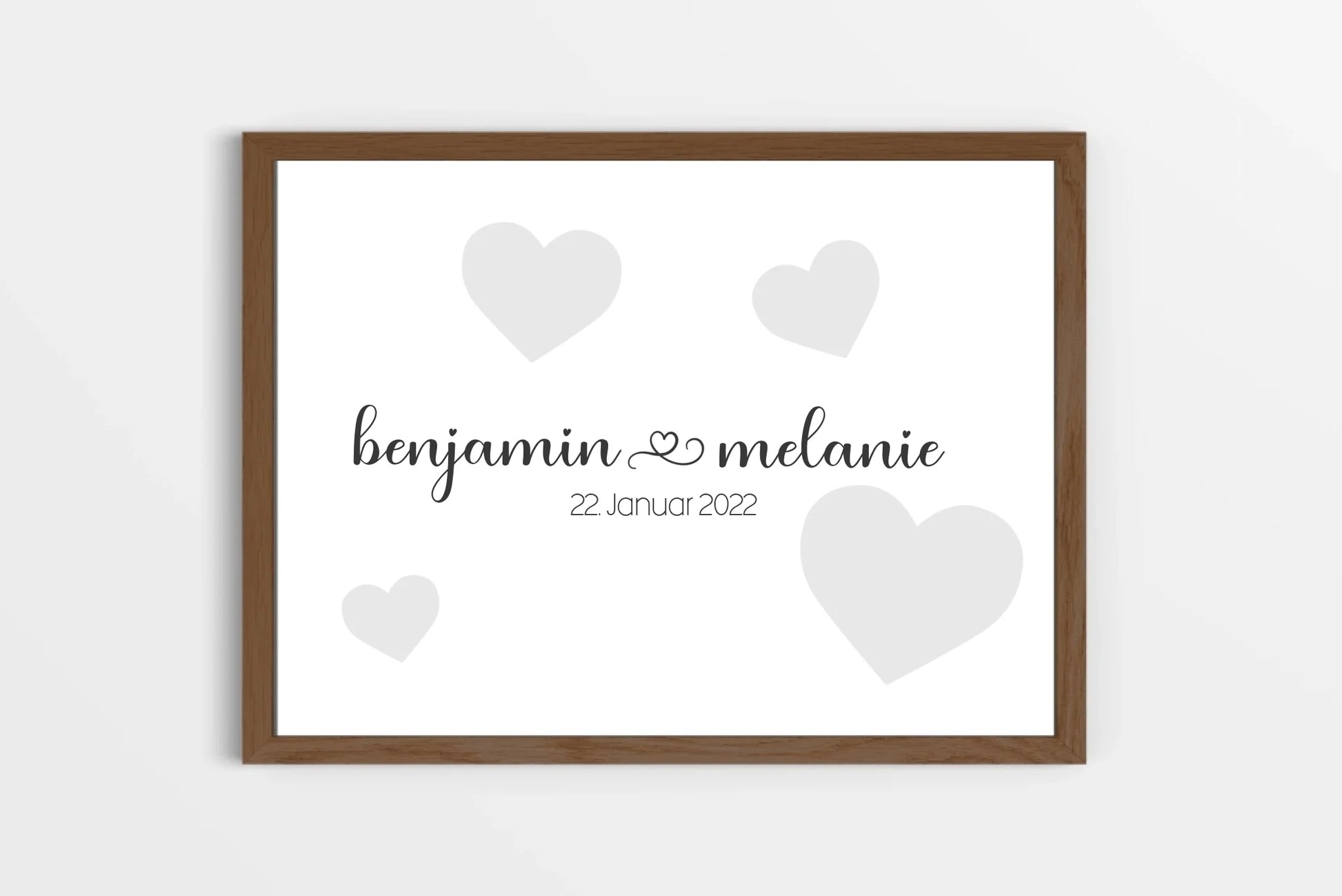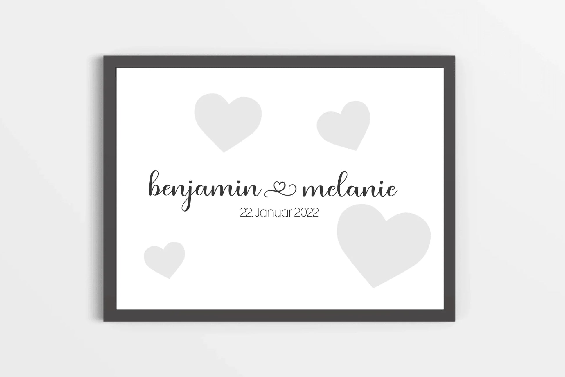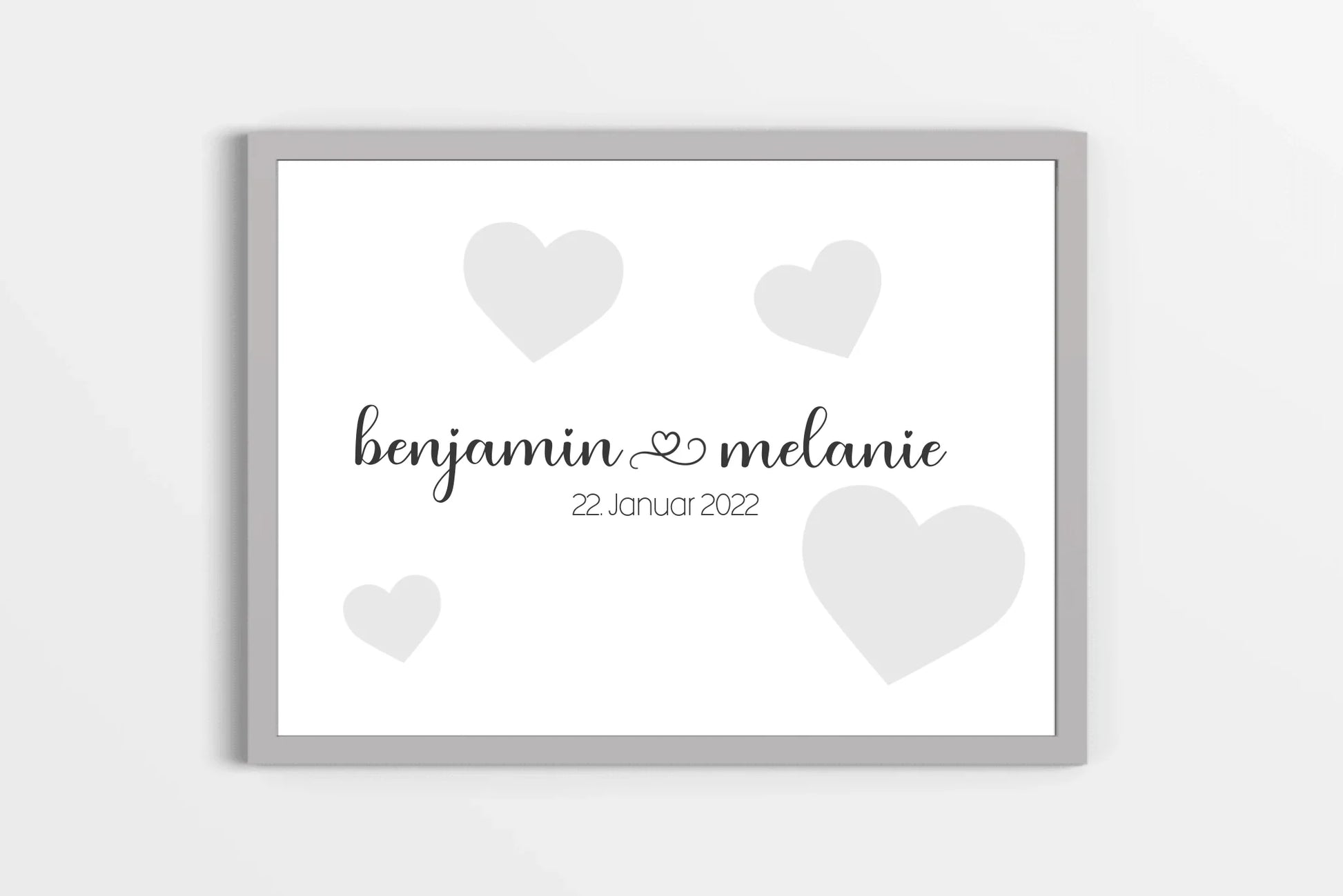 Dieses personalisierte Hochzeitsposter stellt eure Namen und das Hochzeitsdatum in den Mittelpunkt – schlicht, modern und stilvoll. Unaufdringliche Herzen geben dem Design eine warme, romantische Note, ohne vom Wesentlichen abzulenken: eurer gemeinsamen Geschichte. Ein wunderschönes Erinnerungsbild, das euer Zuhause schmückt und euren Hochzeitstag für immer lebendig hält.