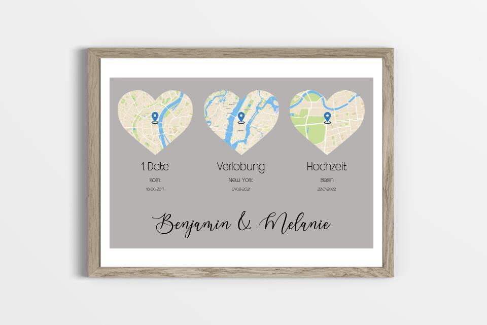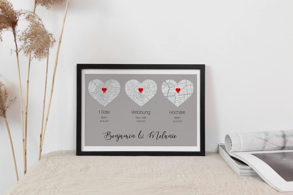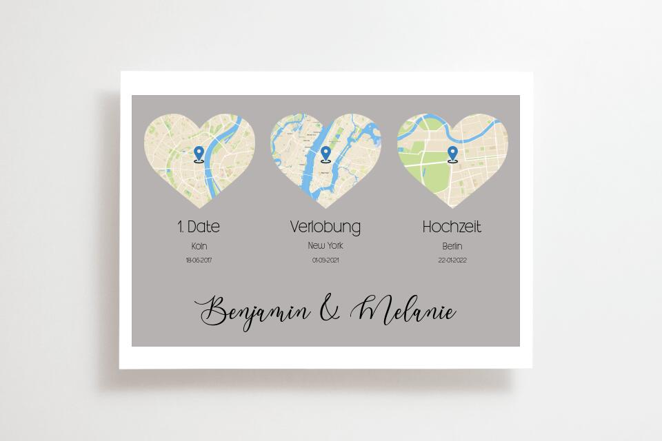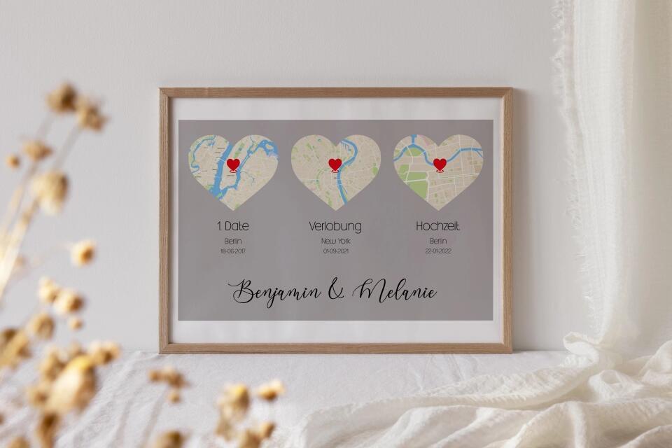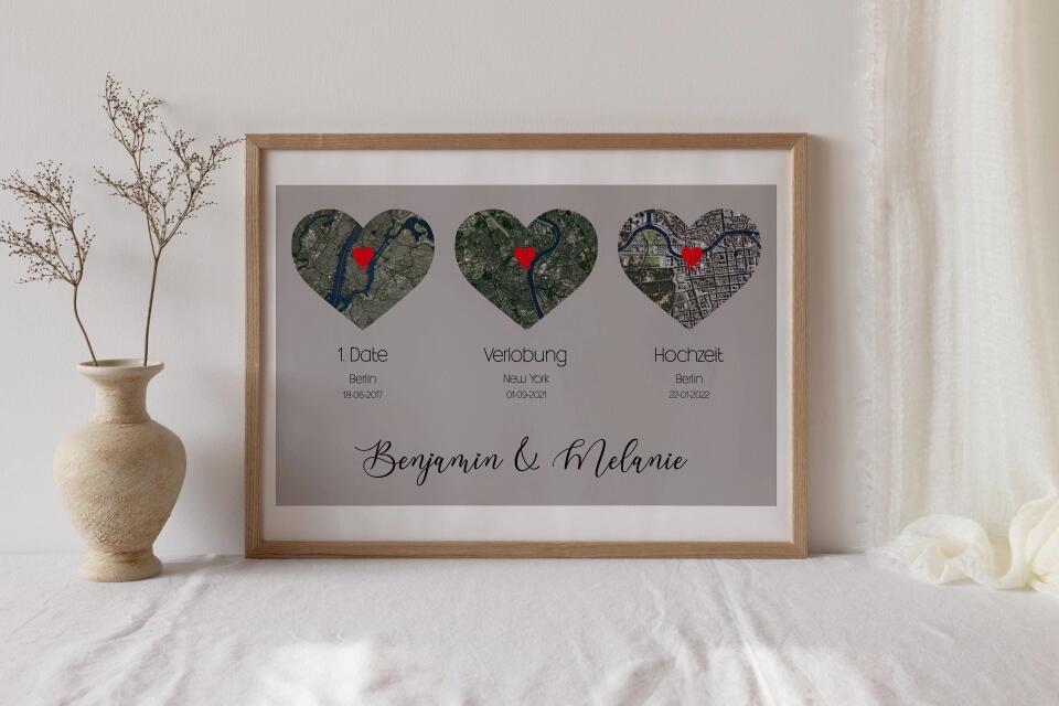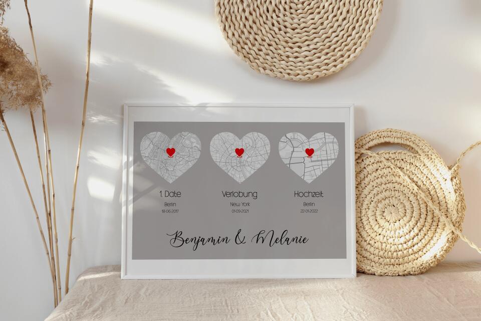 Das personalisierte Karten-Poster mit Herz ist ein einzigartiges Geschenk für besondere Anlässe wie Hochzeiten, Jahrestage oder den Valentinstag.